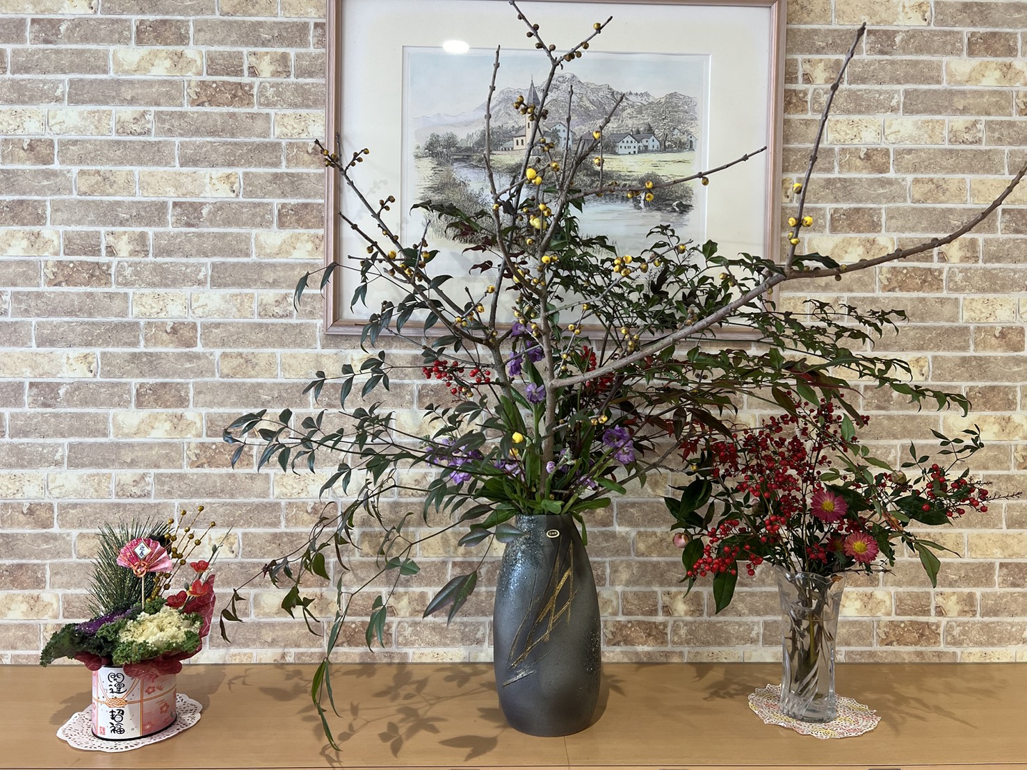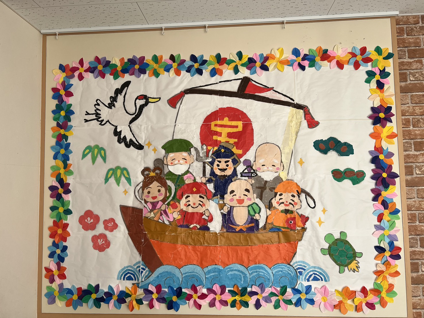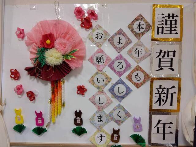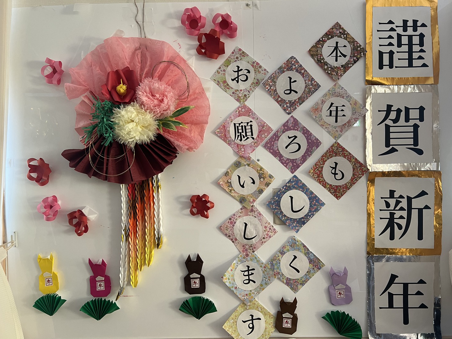 新年のお祝いの壁面飾りは今年も華やかです お正月レクリエーションには「福笑い」と「投扇興」にて皆...