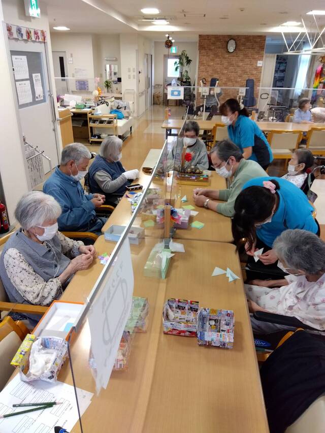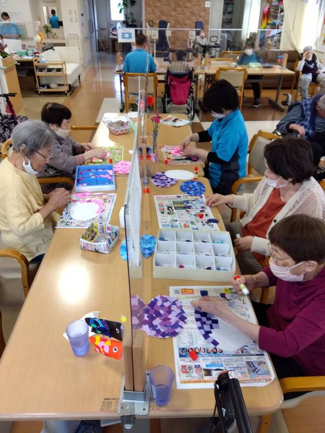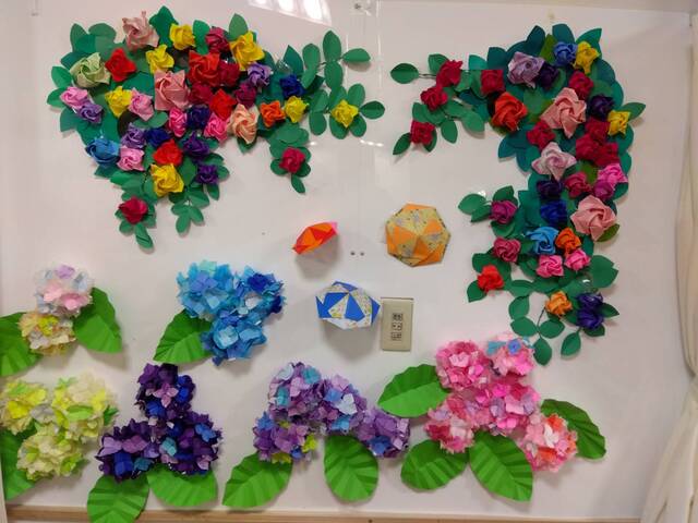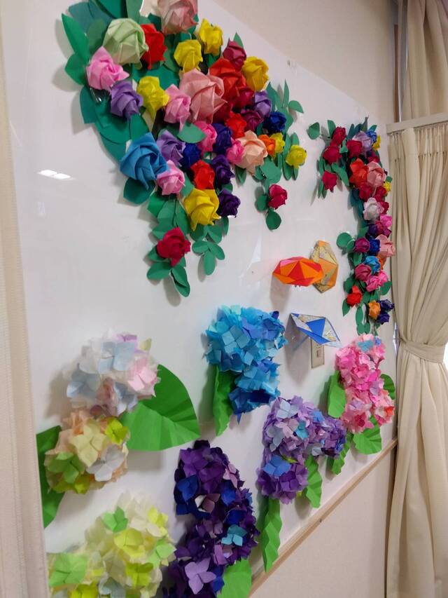 今月は紫陽花の貼り絵に取り組んでいただきました。小さく切った折り紙を丁寧に貼り、色鮮やかな紫陽花の花が完成しました。バラの壁画も利用者の皆さん喜んでくださっています。