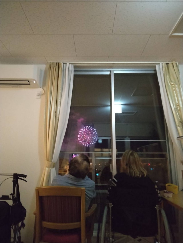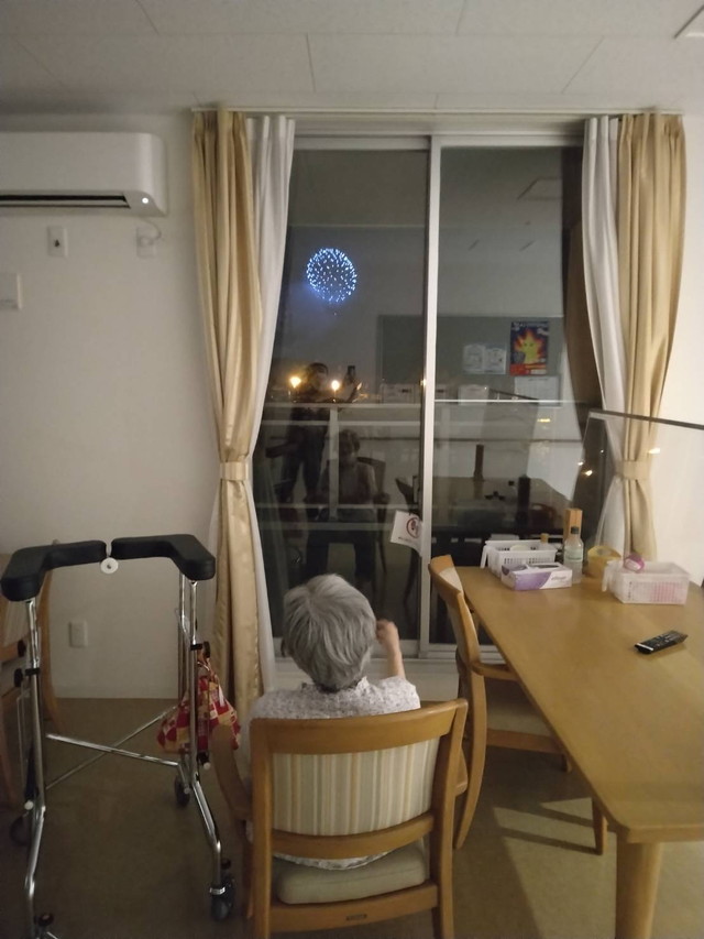 吉野川から打ち上げられる花火を入居者の方もご覧になりました。公園前では食堂から眺める事ができます。