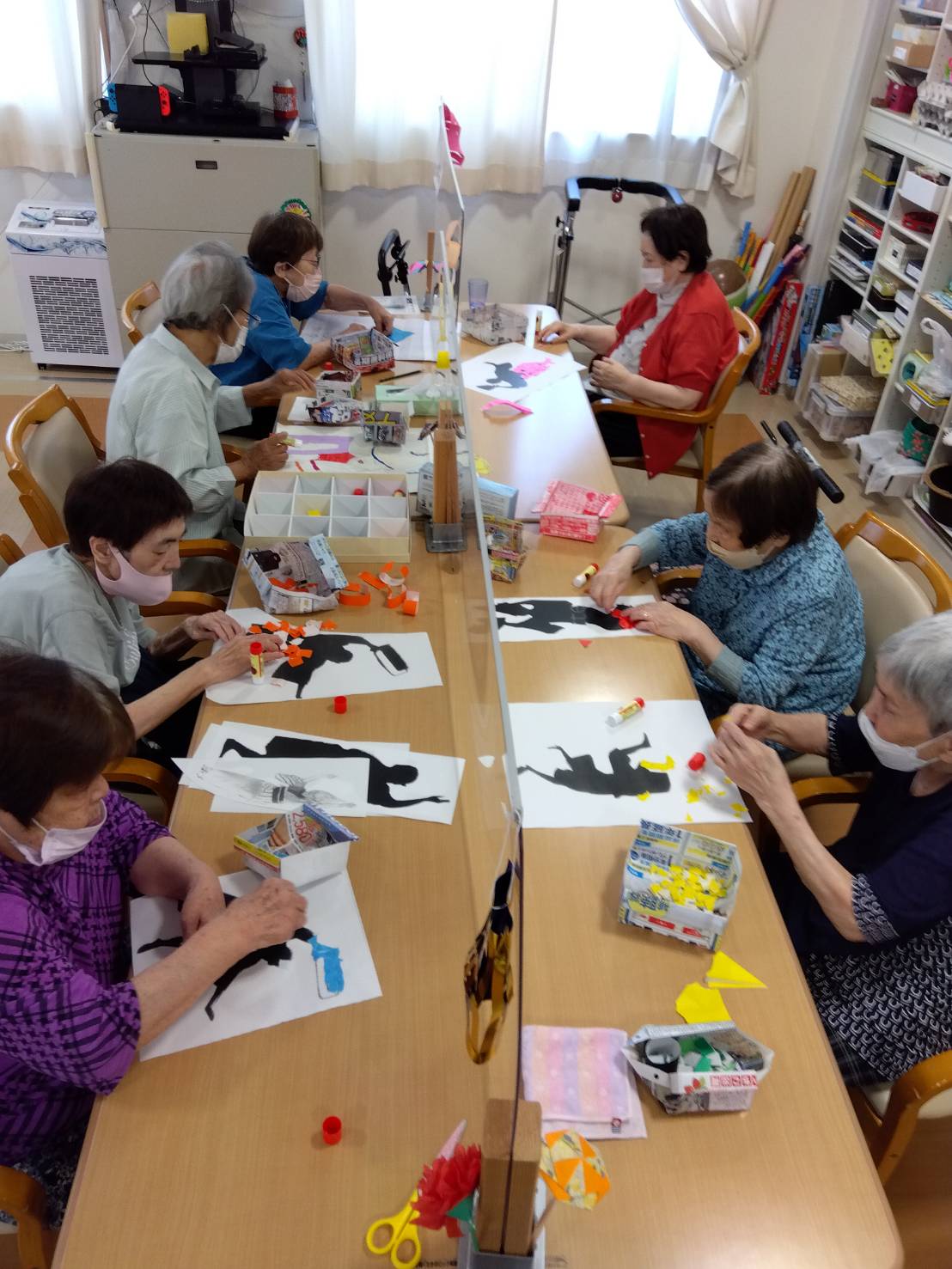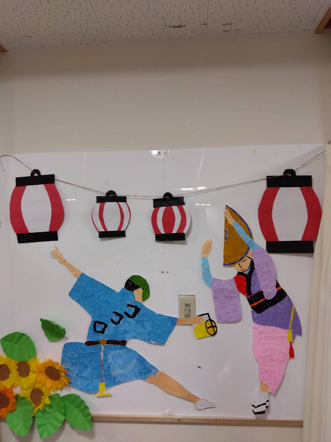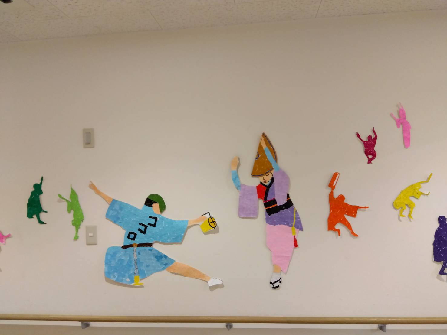 壁面飾りは利用者さんの協力のもと、ちぎり絵で阿波踊りが飾られています。