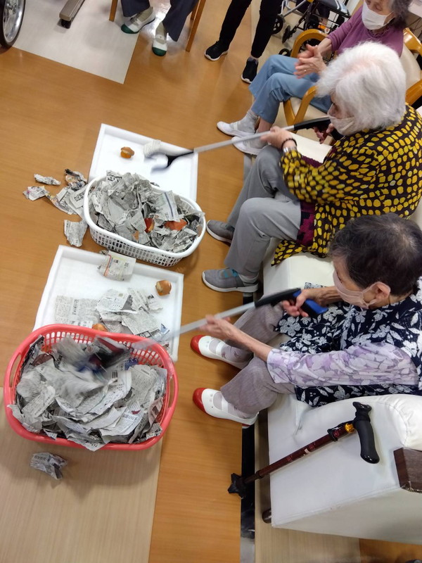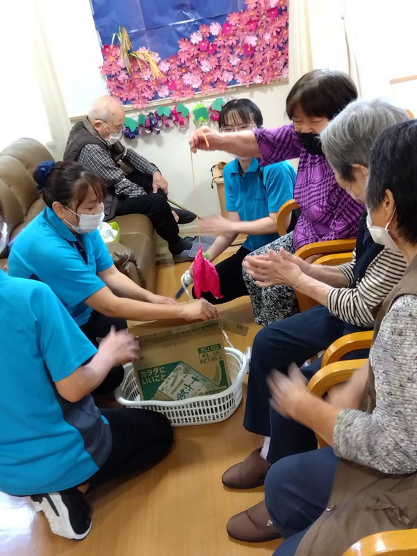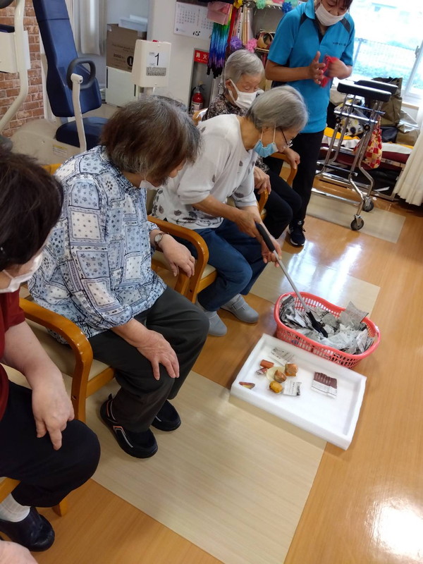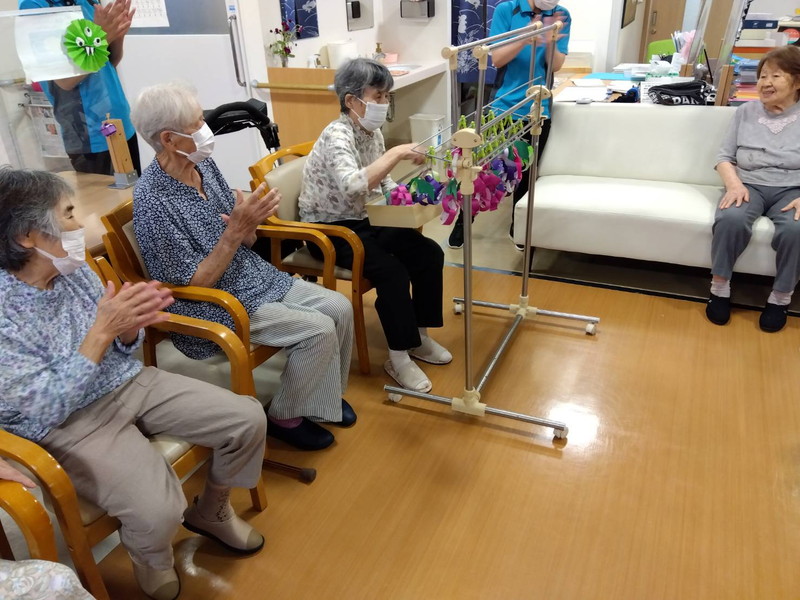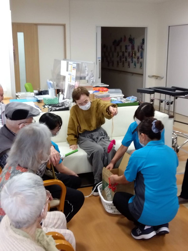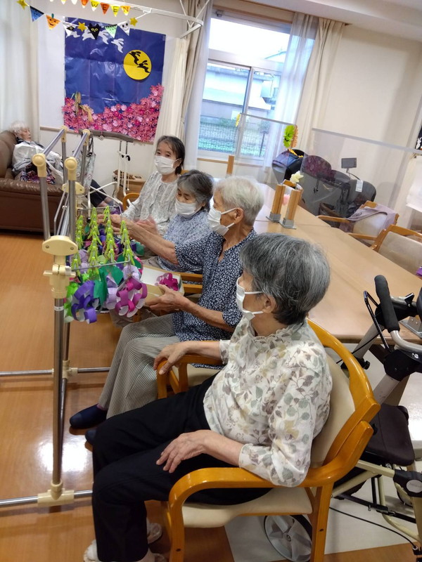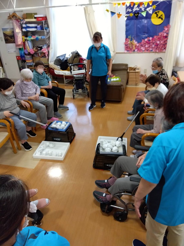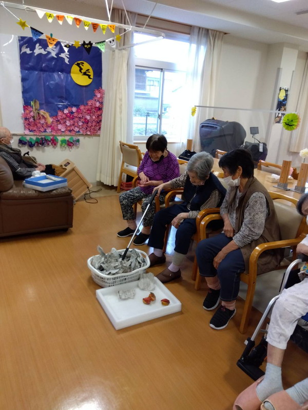 今年の十五夜は10月6日でしたねデイサービス内の渡り廊下や壁に可愛らしいお月見飾りが飾られ、皆さん癒されましたこの期間は秋の味覚のゲームで楽しい時間を過ごされました栗拾いゲームぶどう狩りゲーム芋掘りゲームお月見団子ゲーム