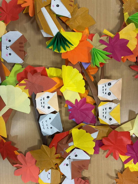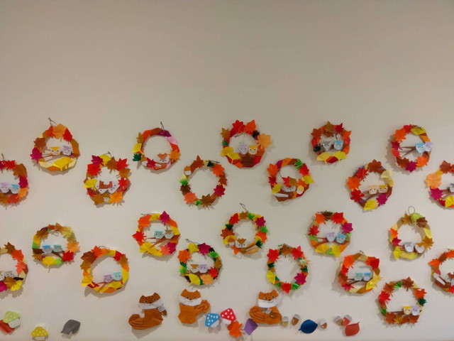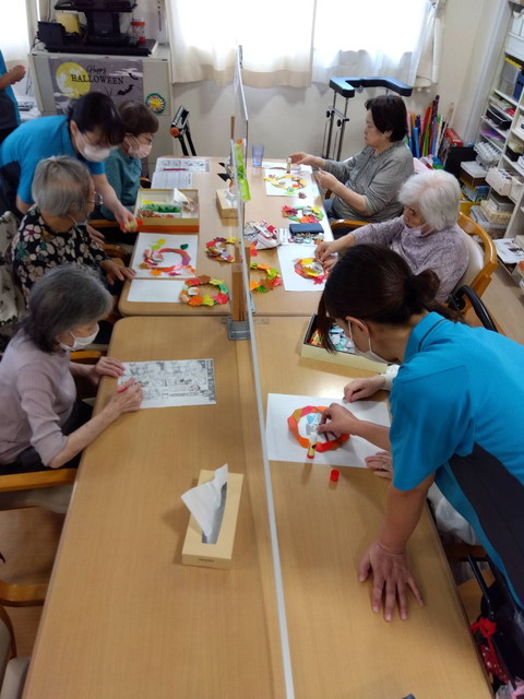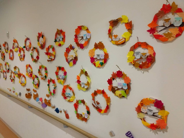 デイルームには利用者の皆さんと一緒に作成した紅葉の壁画や、可愛らしいリースも飾っています。