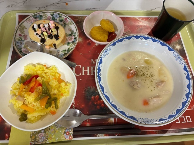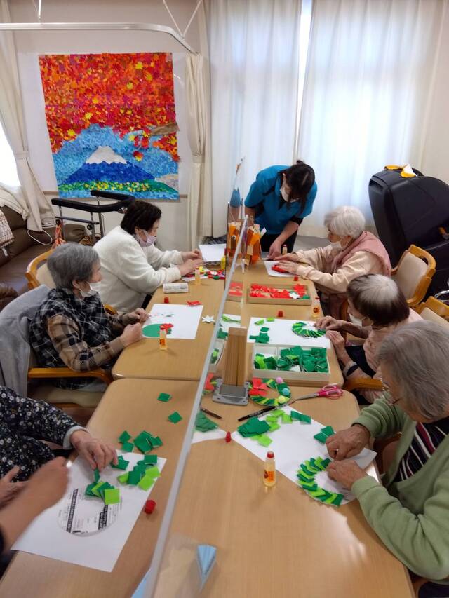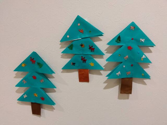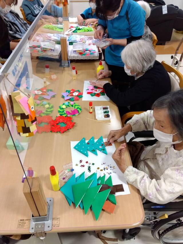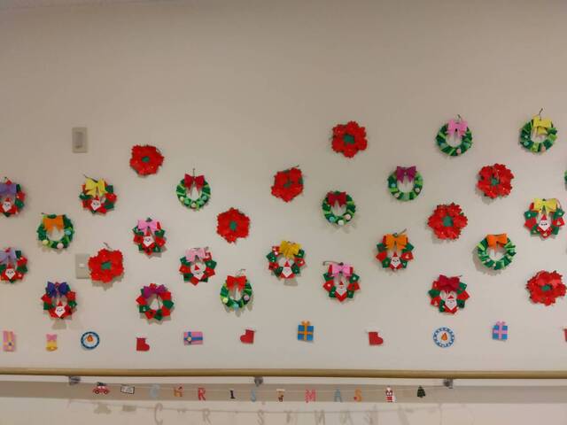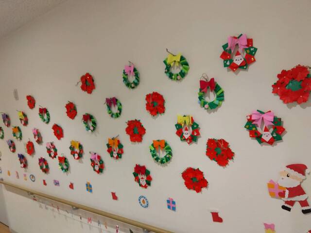 12月23日、25日に毎年恒例のクリスマス会を開催しましたデイルームにはクリスマスソングが流れ、ビンゴ大会やゲームで楽しい時間を過ごされました写真は利用者の方が作って下さったクリスマスツリーやリースの壁面飾りです